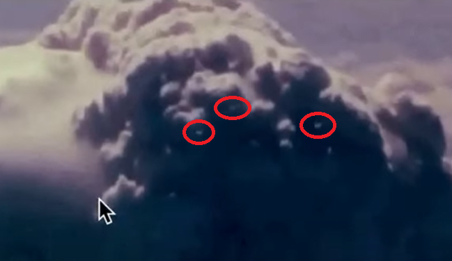 Scott C. Waring, ufologue célèbre sur Internet, a analysé les images de cette explosion et il a remarqué plusieurs éléments surnaturels. Premièrement, à la base du champignon atomique, il a découvert ce qui ressemble à un portail. Ensuite, juste au-dessus du nuage consécutif à l’explosion, il a repéré trois OVNI.