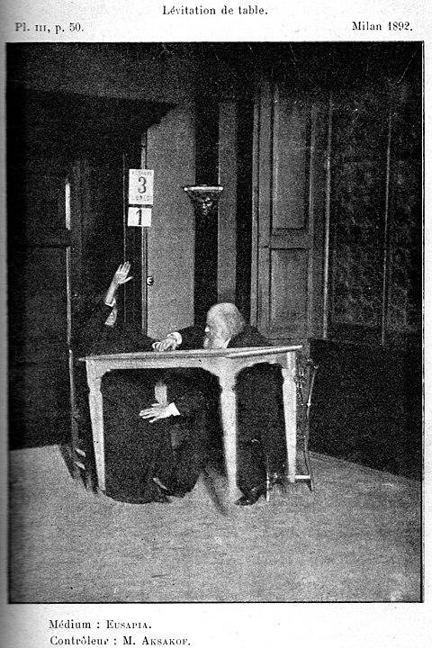Cette photographie a été prise en 1892 à Milan, en Italie. Elle nous montre la medium Eusapia Palladino en train de faire léviter une table tandis que le chercheur Alexander Aksakof vérifie qu’il n’y a pas de fraude.
